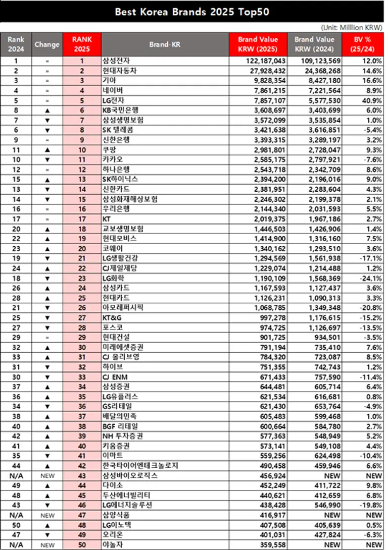 올해 50대 브랜드에 삼성바이오로직스(43위, 4,569억 원)과 삼양식품(47위, 4,169억 원), 야놀자(50위, 3,595억 원)가 새롭게 진입했다.