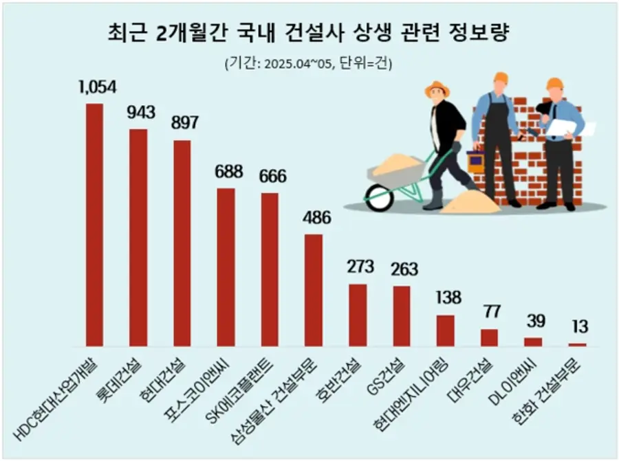 HDC현대산업개발은 상생 관련 포스팅 수 1054건으로 1위를 차지했으며 12개 건설사 중 유일하게 네 자릿수를 기록했다.