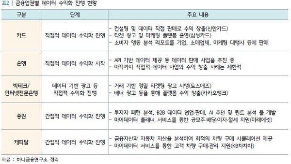 반면, 은행은 아직 간접적 데이터 사업 중심에 머물러 있다. 데이터 판매 등 직접적 수익을 계획중이나 실제 수익으로 이어지는 경우는 제한적이다. 증권사와 캐피탈사 또한 카드사나 은행 대비 초기 단계로, 주로 간접적 데이터 수익화에 집중하는 모습이다.