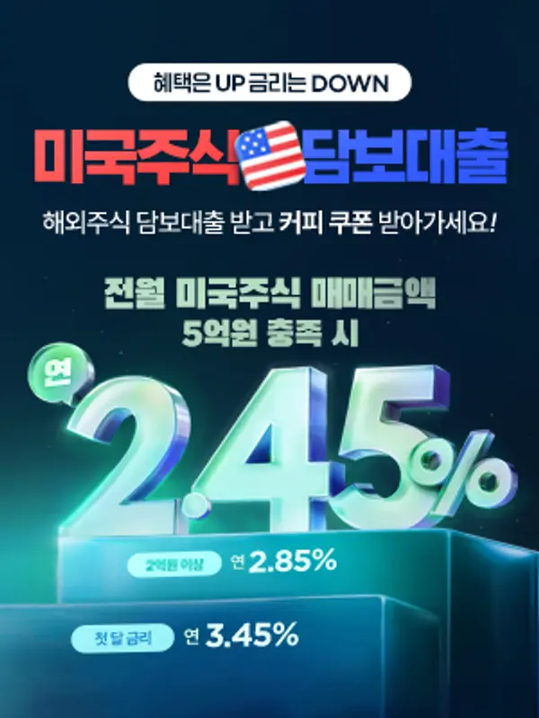 이벤트 기간 내 미국주식 담보대출(인출형)을 신청하는 고객에게 약 12개월간 대출금리를 연 3.45%로 우대 적용한다. 미국 주식 매매 금액에 따라 특별 혜택도 제공하며, 신청일로부터 두 번째 달부터 5개월 동안 전월 미국 주식 매매금액에 따라 최저 2.45%의 특별 금리를 제공한다.