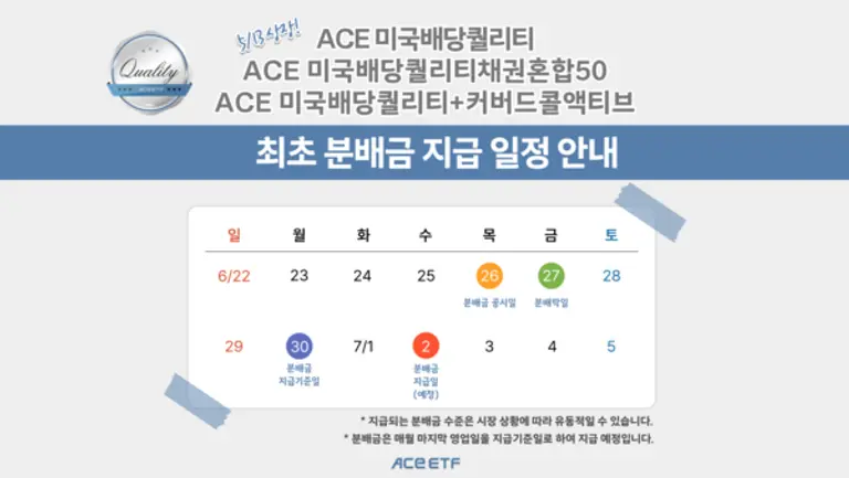 3종 ETF의 첫 번째 분배금은 오는 26일까지 해당 ETF를 매수한 투자자를 대상으로 지급된다. 이번에 지급되는 분배금은 지난 5월 13일 상장 이후 이달 말까지 약 1.5개월분이다. 분배금 규모는 오는 26일 장 마감 이후 ACE ETF 홈페이지 등을 통해 공시될 예정이다.