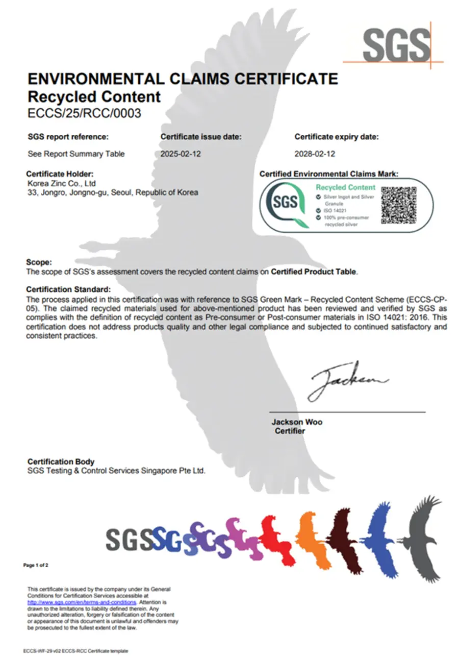|스마트투데이=김세형 기자| 고려아연(회장 최윤범)이 동에 이어 은 제품도 '100% 친환경'이라는 글로벌 인증을 획득하면서 글로벌 친환경 에너지·소재 기업으로 입지를 다지고 있다.