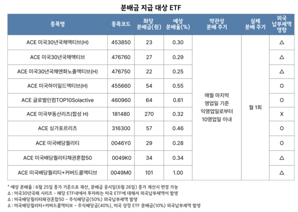 ACE글로벌인컴TOP10Solactive는 좌당 64원(분배율 0.61%), ACE미국하이일드액티브(H)는 좌당 54원, 분배율은 0.55%다.
