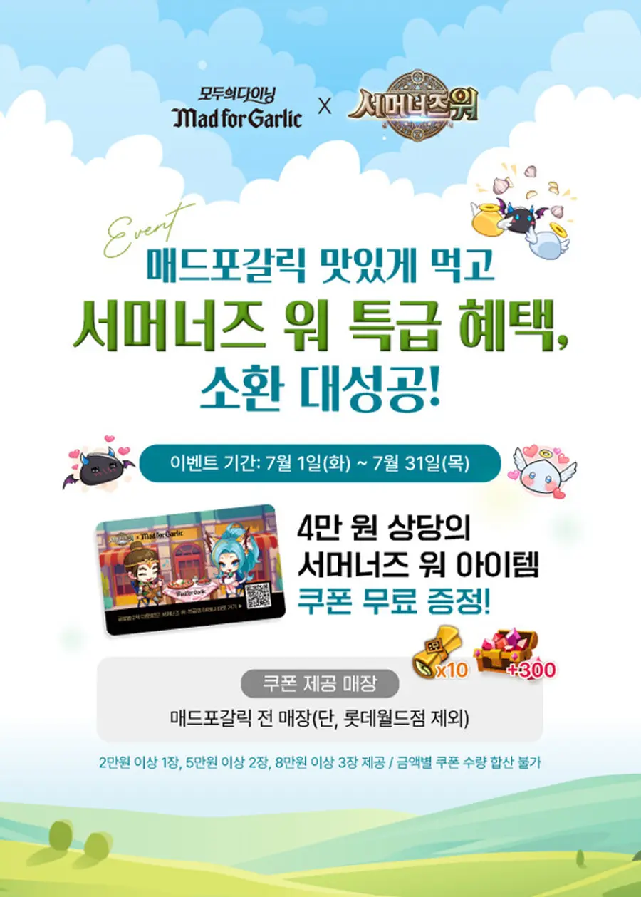 매드포갈릭은 매장을 방문하는 모든 고객들에게 약 4만 원 상당의 ‘서머너즈 워’ 게임 아이템 쿠폰을 증정한다. 해당 쿠폰은 결제 금액에 따라 차등 지급되며 2만 원 이상 결제 시 1장, 5만 원과 8만 원 이상 결제 시 각각 1장씩 추가된다. 쿠폰은 계정 당 최대 5회까지 등록 가능하다.