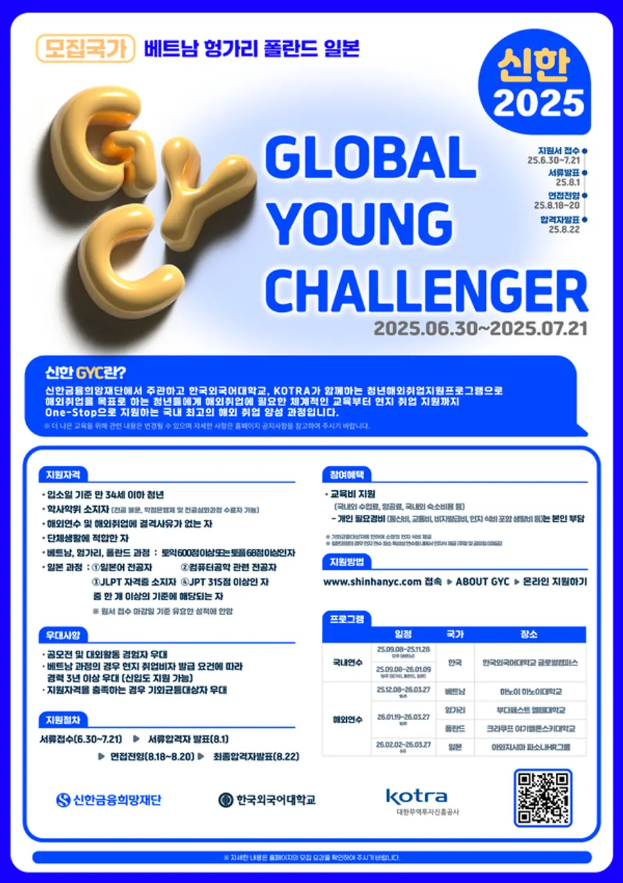 이번 ‘신한 GYC’ 7기는 베트남, 헝가리, 폴란드, 일본 등 4개국에서의 취업 희망 청년들을 모집하며, 특히 지원자 중 기초생활수급자/차상위계층/한부모가정 등 경제적으로 어려운 청년들을 우대해 선발할 예정이다.