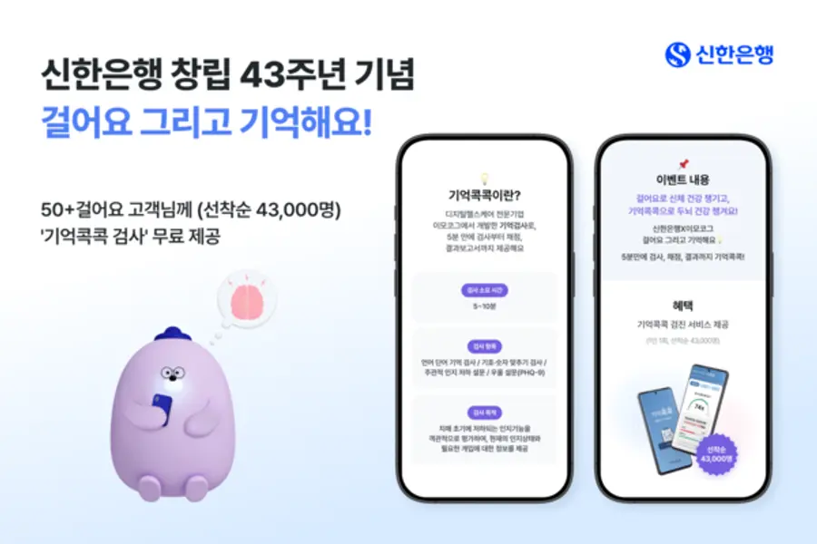 |스마트투데이=김윤진 기자| 신한은행은 창립 43주년을 기념해 1일부터 신한은행 ‘50+ 걸어요’ 가입 고객을 대상으로 ‘걸어요 그리고 기억해요’ 이벤트를 진행한다.