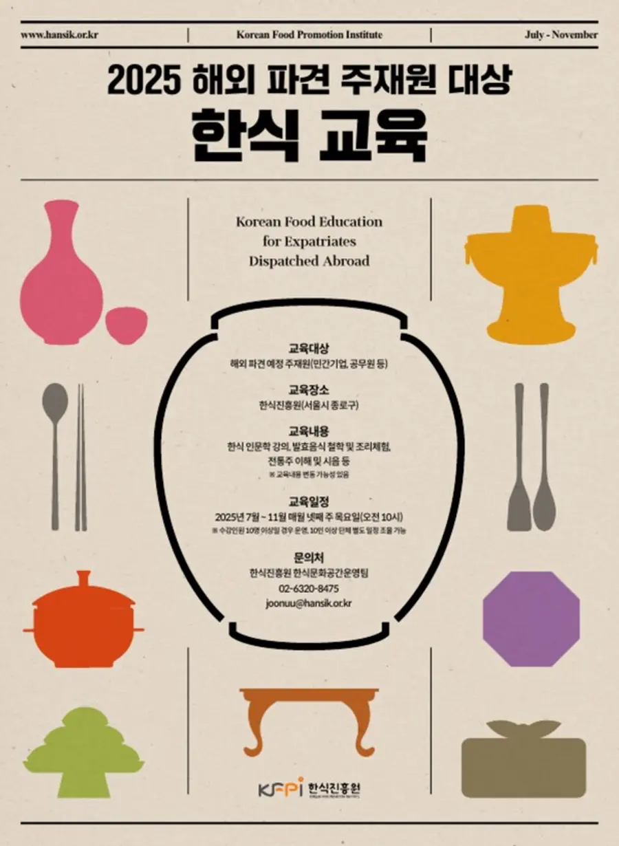 이번 교육은 해외 파견 예정인 민간 기업 주재원과 외교관 등을 대상으로, 외교 현장에서 한식을 효과적으로 소개할 수 있도록 지원하기 위해 기획됐다. 매월 넷째 주 목요일 오전 10시 서울 종로구 한식문화공간 이음에서 한식과 문화를 폭넓게 다루는 실전 교양 과정으로 진행된다. 단 교육은 수강 인원이 10명 이상일 경우에 운영되며, 10인 이상 단체는 별도 협의를 통해 일정 조율이 가능하다.