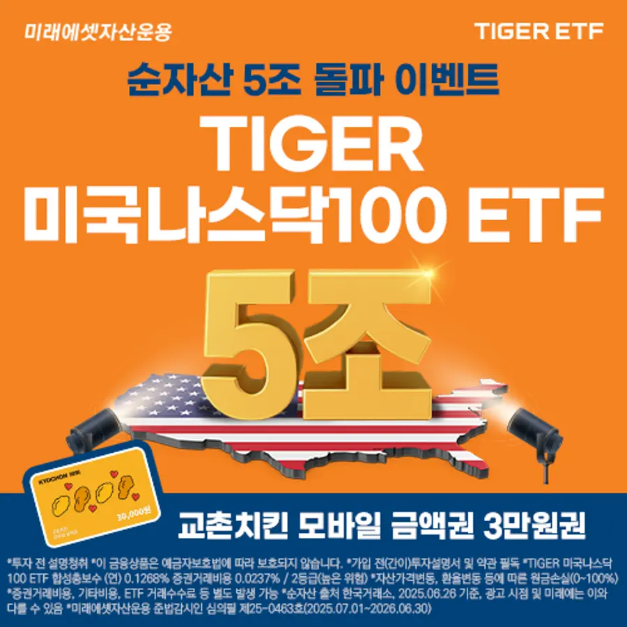 한편, 미래에셋자산운용은 ‘TIGER 미국나스닥100 ETF’ 순자산 5조원 돌파를 기념해 거래 고객을 대상으로 매수 이벤트를 진행한다. 7월 3일부터 25일까지 'TIGER 미국나스닥100 ETF'를 매수하거나 보유한 고객을 대상으로 추첨을 통해 기프티콘을 제공한다. 자세한 이벤트 내용은 TIGER ETF 홈페이지에서 확인 가능하다.