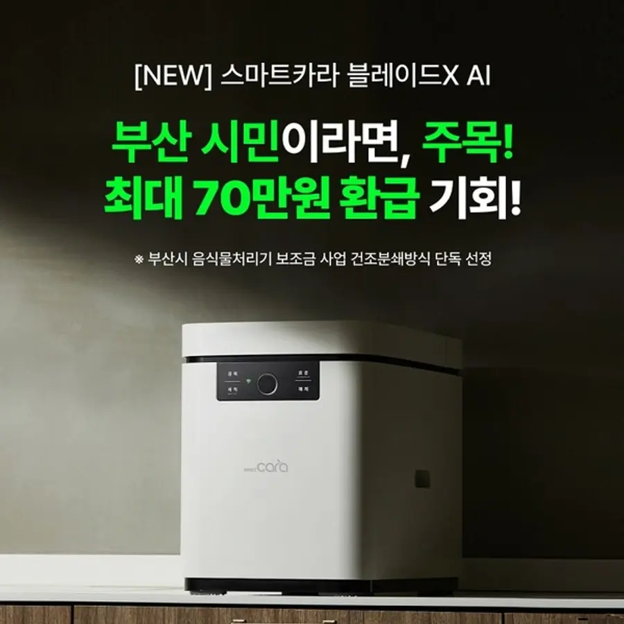 스마트카라 관계자는 “음식물처리기를 구매할 때는 기업 역량, 제품 안전성, 친환경 인증 획득 및 보조금 지원사업 대상 여부 등을 꼼꼼히 확인하는 것이 중요하다”고 말하며, “이번 부산시 음식물처리기 보조금 지원사업을 통해 더욱 많은 분들이 신제품 블레이드X AI를 경험하고 보조금 혜택까지 받으시기 바란다“고 말했다.