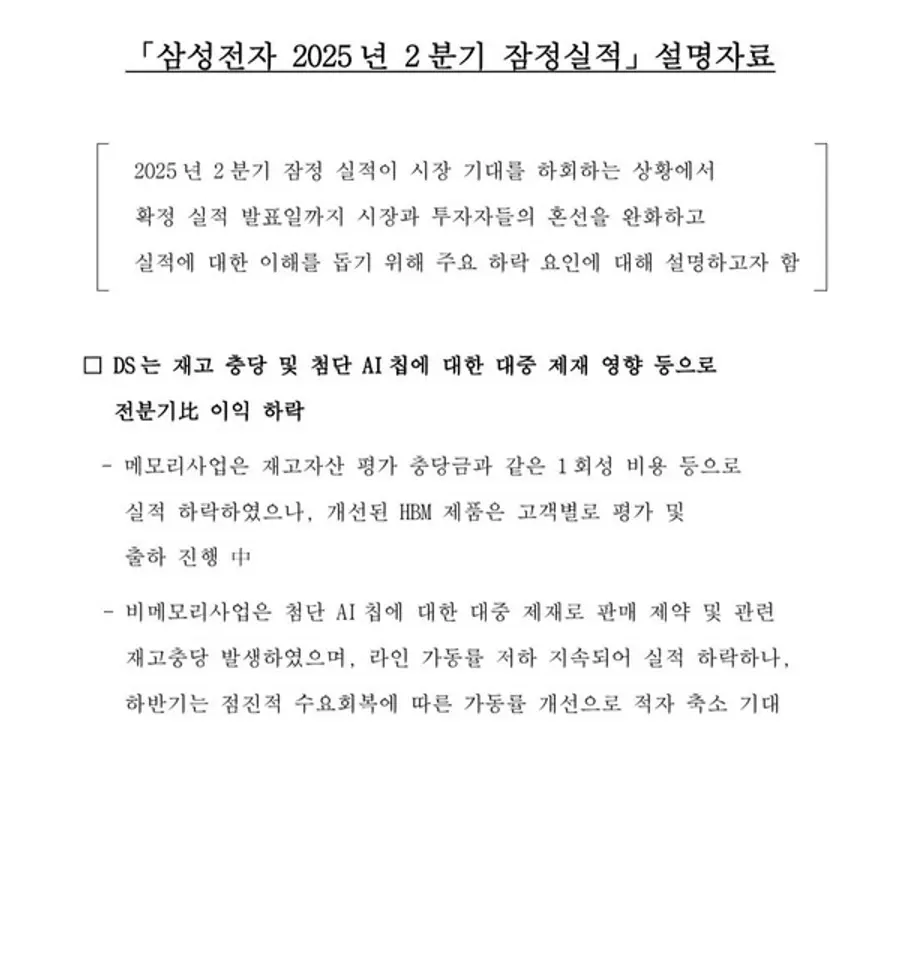 삼성전자는 "2분기 잠정 실적이 시장 기대를 하회하는 상황에서 확정 실적 발표일까지 시장과 투자자들의 혼선을 완화하고 실적에 대한 이해를 돕기 위해 주요 하락 요인에 대해 설명하고자 한다"고 밝혔다.