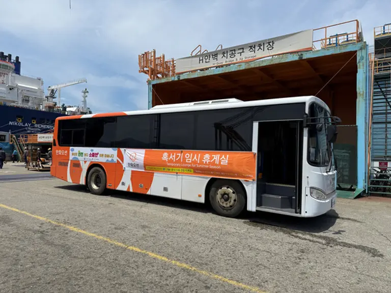 10일 한화오션에 따르면 한화오션은 이달부터 9월까지 냉방버스를 운영한다. 현재 냉방버스가 찾아간 작업장은 해양플랜트 건조구역이다.
