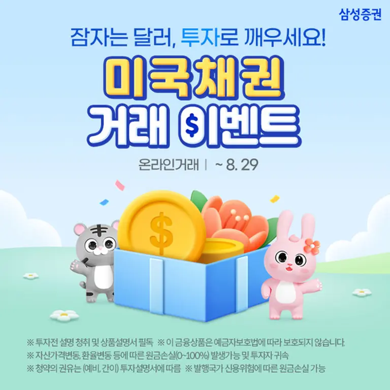 |스마트투데이=김세형 기자| 삼성증권은 미국채권 온라인 첫 거래 고객 대상으로 최대 20만원을 지급하는 이벤트를 8월 29일까지 진행한다고 10일 밝혔다.