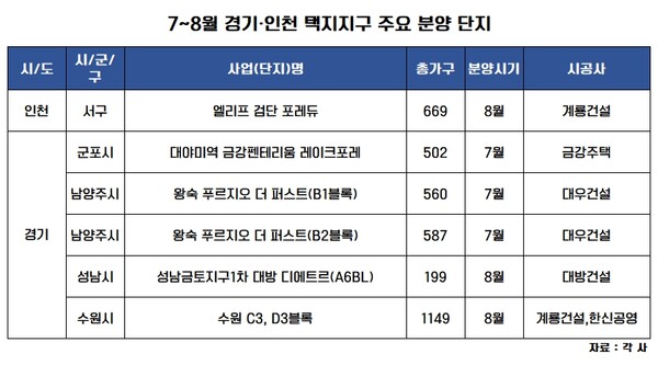 15일 부동산인포에 따르면 7월과 8월 사이 경기·인천에서는 총 2만2,486가구의 신규 분양이 예정돼 있다. 이 중 6566가구가 경기평택·남양주·군포·수원·인천검단 등 지역의 택지지구에서 공급된다.