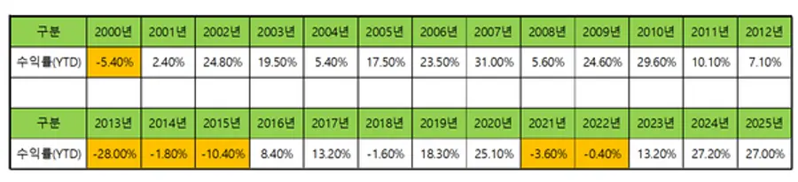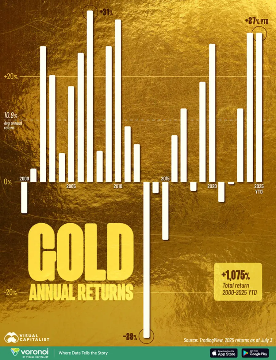 2000년부터 2025년까지 금은 투자자들의 자산을 10배 이상(1075%) 이상 늘려주는 좋은 투자처가 됐다. 지난 25년간 금 가격이 약간의 변동성이 있었지만 연평균 10.9%씩의 수익을 가져다 준 셈이다.