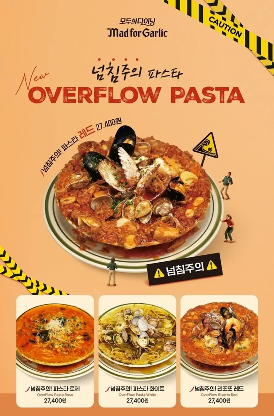 21일 매드포갈릭에 따르면 지난 1일 첫 선을 보인 매드포갈릭의 ‘넘침주의(Overflow)’ 시리즈는 접시 위로 넘칠 듯 푸짐한 양과 진한 맛을 강조한 여름맞이 신메뉴로 베이스 소스에 따라 레드, 로제, 화이트 등 파스타 3종과 신선한 해산물을 가득 넣은 매콤한 리조또 1종 등 총 4가지 메뉴로 구성돼 있다.
