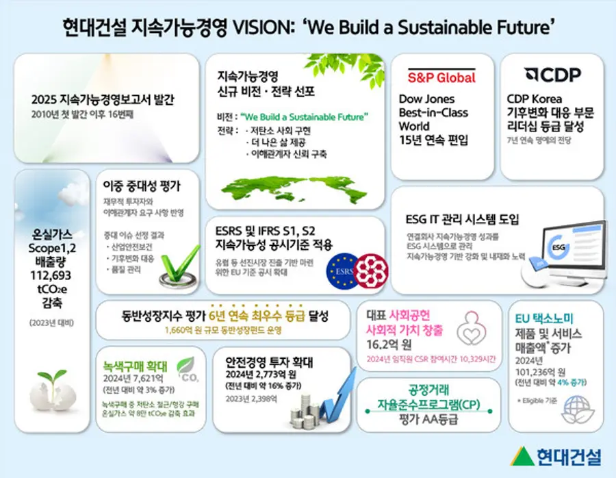 한편, 현대건설은 지속가능경영보고서를 통해 매년 ESG 성과를 투명하게 공개하고 있으며, 다우존스 지속가능경영 월드지수 15년 연속 편입, CDP Korea 명예의 전당 7년 연속 등재 등 글로벌 평가기관의 인증을 통해 ESG 선도 기업으로서의 입지를 강화하고 있다.