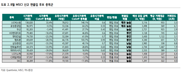 하나증권은 미국 동부 시간 8월8일 오전 발표되는 8월 MSCI코리아 리뷰의 핵심은 한국 편입 종목 수의 증가 가능성이 될 것이라며 이같이 추정했다.