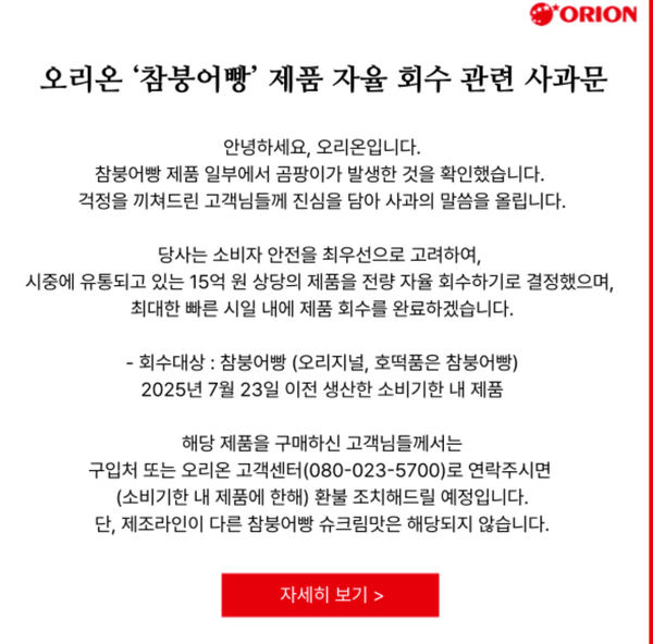 사측은 이날 공식 입장문을 통해 “참붕어빵 제품 일부에서 곰팡이 발생 사례가 확인됐다”며 “소비자 안전을 최우선으로 고려해 시중에 유통되고 있는 제품을 전량 자율 회수하기로 결정했다”고 설명했다.