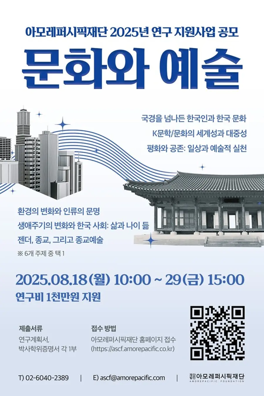 |스마트투데이=김세형 기자| 아모레퍼시픽재단(이사장 서경배)이 2025년 ‘문화와 예술’ 분야 연구 지원사업 지원자를 공모한다.