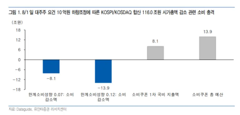 유안타증권은 "지난달 31일 상장주식 대주주 판단 기준이 현행 인별 50억원에서 10억원으로 대폭 하향조정된 세제개편안이 발표됐고, 관련 충격은 8월1일 하루사이 국내증시 116조원대 시가총액 증발로 구체화했다"며 "노벨 경제학상 수상자 로버트 쉴러가 논문에서 실증분석한 한계소비성향대로라면 잠재 소비 여력이 8.1조원 가량 감소한 것으로 이는 민생회복 소비쿠폰 1차 예산 관련 국비 지출액인 8.1조원과 완벽히 동일하다"고 주장했다.