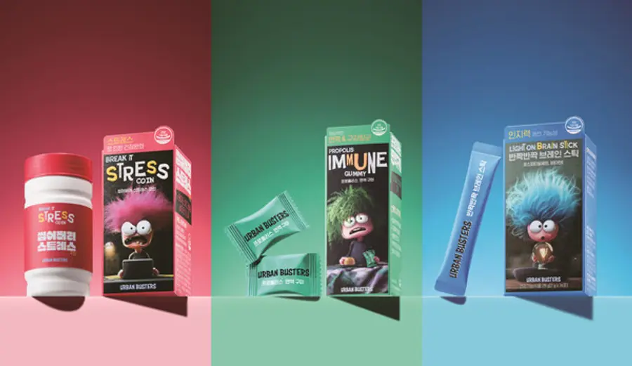 대표 제품인 ‘어반버스터즈 씹어버려 스트레스 코인’은 식품의약품안전처에서 ‘스트레스로 인한 긴장 완화’ 기능성을 인정받았다. 스트레스로 인한 긴장을 완화시키는 ‘테아닌' 성분과 신경 및 근육 기능 유지에 필요한 마그네슘을 담았다. 달콤하면서 쌉싸름한 말차 티라미수 맛 코인 제형으로 간편하게 씹어서 섭취할 수 있다.