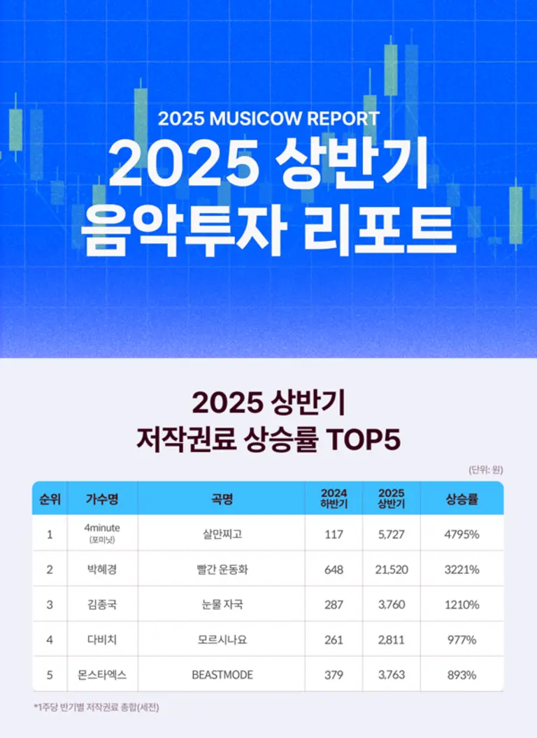 1위는 발매 당시 단 한 번의 방송 활동 없이 음악 프로그램 순위 상위권에 올라 화제를 모았던 4minute의 ‘살만찌고’가 차지했다. 2024년 하반기 대비 2025년 상반기 음악증권 1주당 저작권료가 4795% 상승했다.