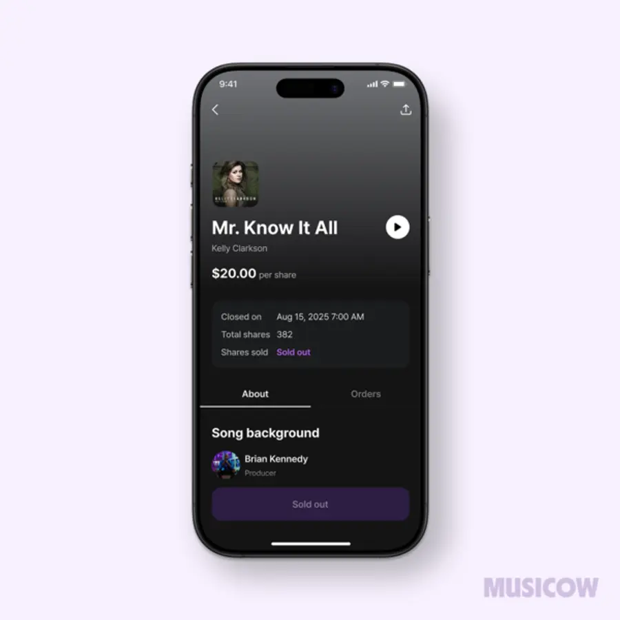 |스마트투데이=김세형 기자| (캡션) 뮤직카우 US가 8월 5일(현지 시간 기준) 세계적인 팝스타 켈리 클락슨(Kelly Clarkson)의 ‘Mr. Know It All’ 저작권을 기초자산으로 한 1호 음악증권 공모 수량을 100% 완판시켰다.