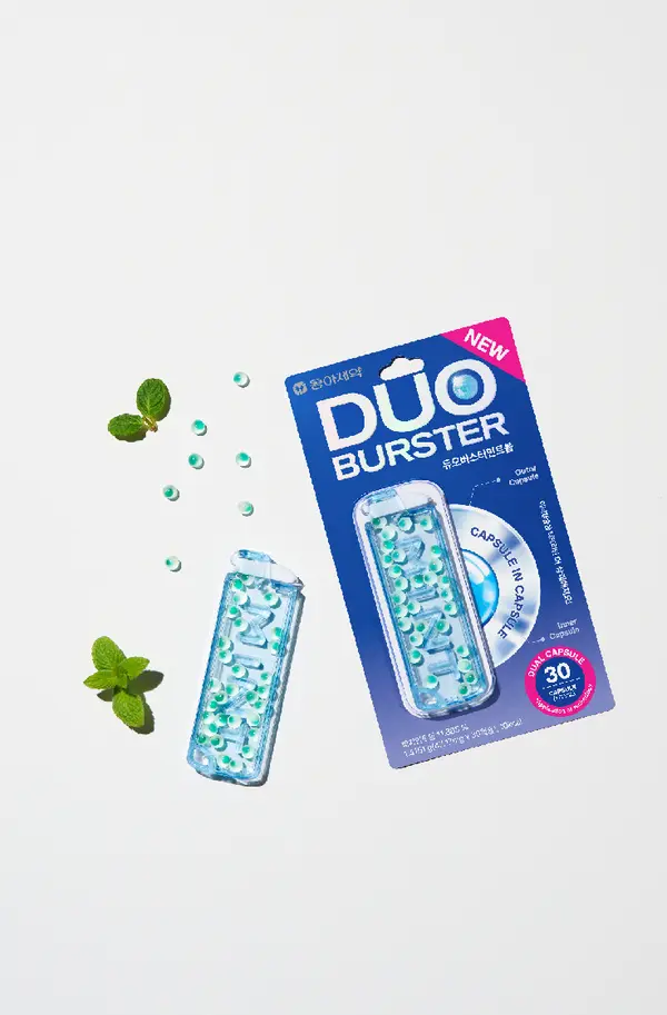 듀오버스터 민트볼은 페퍼민트 에센스를 함유한 4.7mm의 액상 캡슐 형태의 구취 케어 제품으로, 섭취 시 입 안 가득 상쾌함을 선사한다.