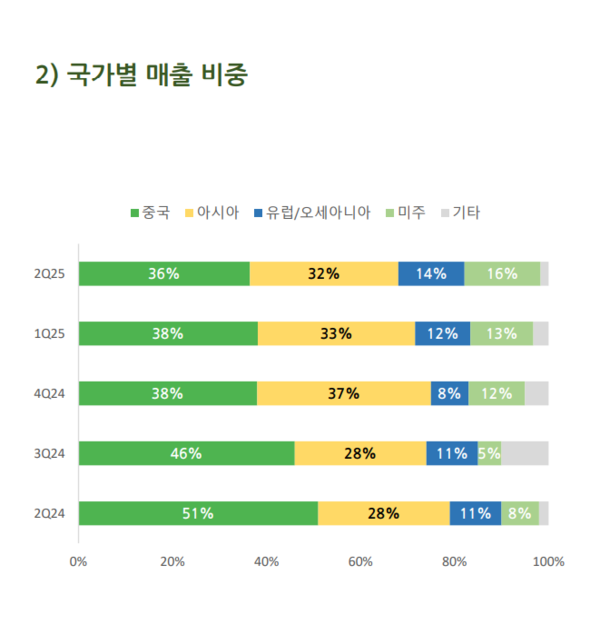 2분기 실적에서는 국가별 매출도 변화가 있었다. 지난해 2분기 국가별 수출 비중은 중국 51%, 아시아 28%, 유럽/오세아니아 11%, 미주 8%였다.