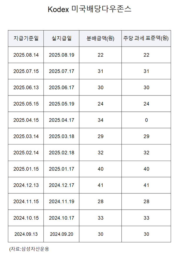 KODEX 미국배당다우존스의 이달 분배금은 1좌당 22원으로 안내되고 있다. 지난 7월 분배금 31원에 비해 29% 감소가 예상된다. 작년말 계엄 파동으로 국내 금융시장이 어수선할 당시 이 상품의 1좌당 분배금은 41원을 기록했다. 이에 비하면 월배당액이 거의 절반 가량 줄었다.