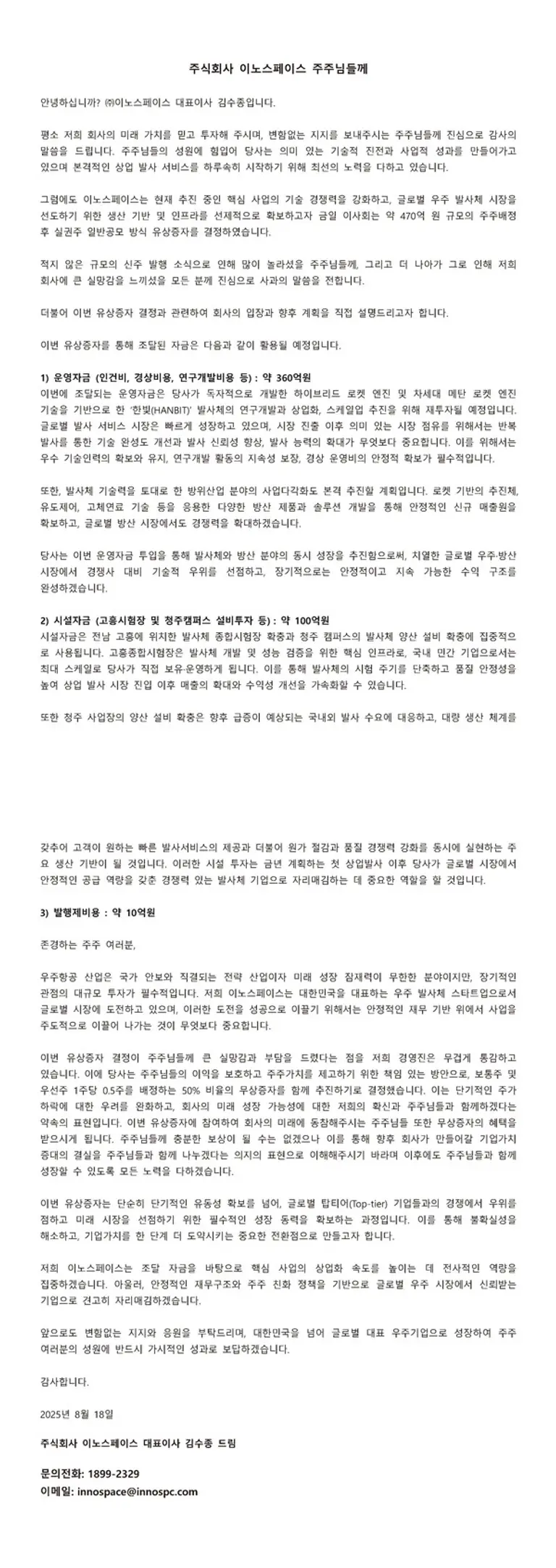 이노스페이스는 유상증자 결의와 관련한 주주서한에서 "글로벌 우주 발사체 시장을 선도하기 위한 생산 기반 및 인프라를 선제적으로 확보하고자 유상증자를 결정했다"며 "이번 증자 결정이 주주님들께 큰 실망감과 부담을 드렸다는 점을 경영진은 무겁게 통감하고 있다"고 밝혔다.