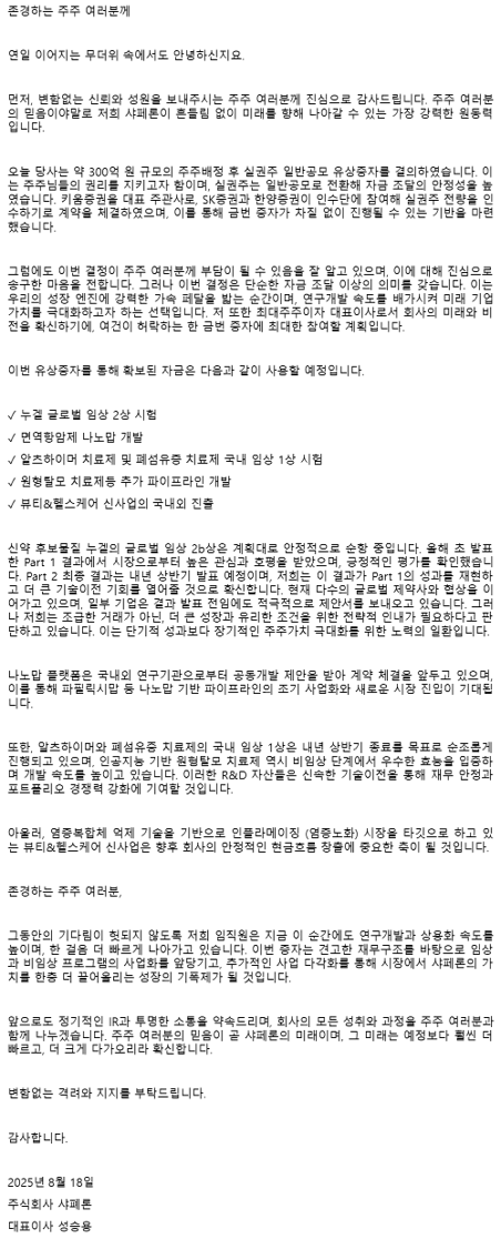 |스마트투데이=김세형 기자| 샤페론은 300억원 규모 주주배정 유상증자를 실시한다. 최대주주는 5분의 1 규모로 참여한다.
