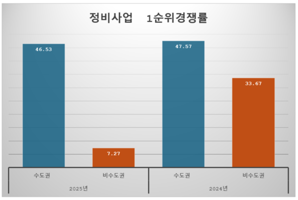 수도권 정비 사업의 인기는 꾸준히 이어지고 있다. 지난해 수도권 정비사업 경쟁률은 47.57대 1이었고, 올해도 46.53대 1로 여전히 고공행진을 이어가고 있다. 불과 1년 전만 해도 수도권과 유사한 경쟁률 패턴을 보이던 비수도권은 인구 감소와 시장 확산 동력 약화가 겹치며 투자 수요가 빠르게 이탈하고 있는 모습이다.