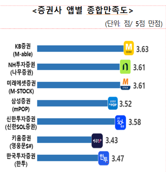 증권사 앱의 종합만족도조사에서 ‘KB증권(M-able)’이 1위를 차지했다. KB증권이 얻은 만족도 점수는 3.63점으로 가장 높았다. 이어 ‘NH투자증권(나무증권)’과 ‘미래에셋증권(M-STOCK)’이 각각 3.61점을 기록했고, 신한투자증권(신한SOL증권)은 3.58점으로 이번 MTS 평균 만족도 점수인 3.55점을 소폭 웃돌았다.