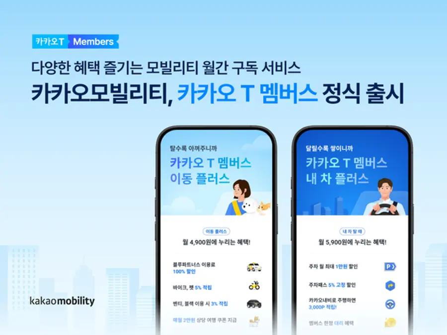 ‘카카오 T 멤버스'는 사람을 넘어 사물과 서비스의 이동까지 포괄하는 MaaS(서비스형 모빌리티, Mobility as a Service) 라이프 스타일을 제안하는 구독상품이다. 내비∙택시∙바이크∙여행 등 카카오 T 서비스에 대한 쿠폰 및 적립 혜택을 제공해 다양한 이동 서비스를 이용하는 고객들에게 활용도가 높을 것으로 기대된다.