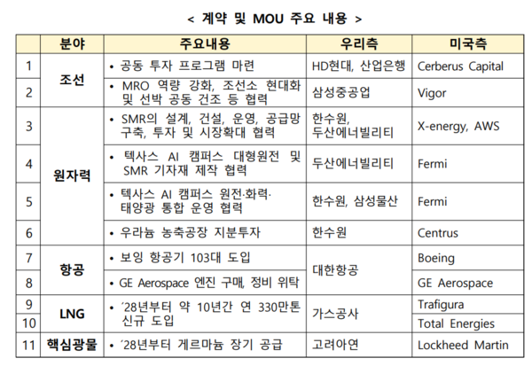 산업통상자원부는 "특히, 조선, 원자력 등 전략 산업 분야에서 양국간 협력을 확대하기 위한 공동펀드 조성, 투자, 기술 협력을 내용으로 하는 MOU가 6건 체결됐다"며 "항공, LNG 분야에서는 우리 기업의 안정적인 사업 운영을 위한 계약 및 MOU 4건, 공급망 분야에서는 우리 기업의 핵심 희소금속 대미 수출을 위한 MOU가 체결됐다"고 소개했다.