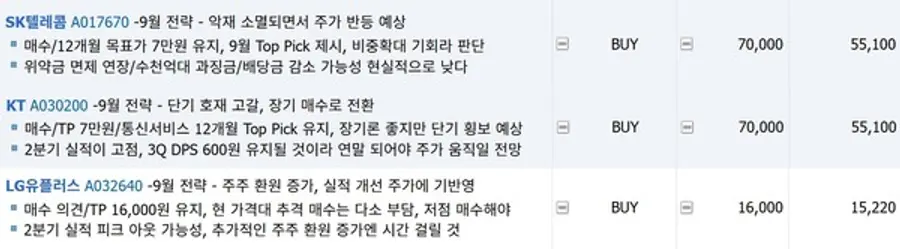 반면 KT에 대해서는 "2분기 실적이 이미 고점을 찍었고, 3분기 DPS(주당배당금) 600원이 유지, 연말쯤에서야 주가가 움직일 수 있다"며 "단기 호재 고갈로 인해 장기 매수로 전환할 때"라고 지적했다.