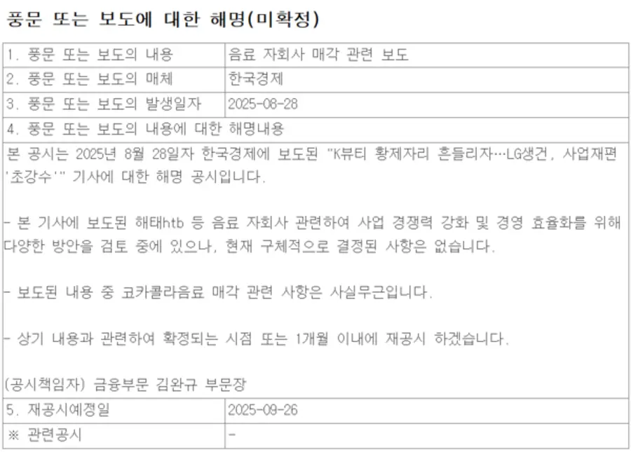 사업 재편을 위해 해태htb와 코카콜라음료 등의 음료 부문 매각을 진행하고 있다는 보도와 관련해서다.