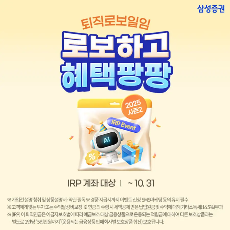 |스마트투데이=김세형 기자| 삼성증권이 퇴직연금 IRP 계좌 로보일임 서비스 순입금 고객을 대상으로 상품권을 지급하는 이벤트를 10월 31일까지 진행한다고 밝혔다.
