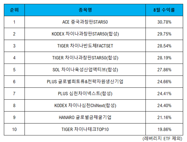이 같은 우호적인 환경 아래 8월 수익률 1위를 달성한 ETF는 ACE 중국과창판STAR50로, 수익률은 30.78%에 달한다. 이 수익률은 같은 테마의 ETF인 KODEX 차이나과창판STAR50(합성)(2위)와 TIGER 차이나과창판STAR50(합성)(4위)보다 1.03%포인트와 2.59%포인트 앞선다.