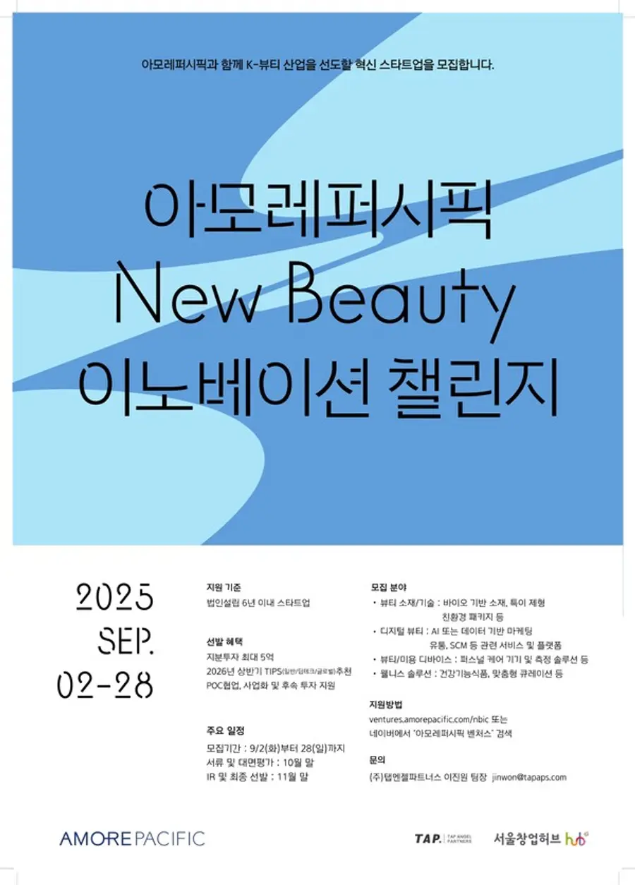 이번 공모는 아모레퍼시픽의 뷰티 스타트업 지원의 일환으로, 기술 기반의 스타트업을 선제적으로 발굴해 뷰티 산업 미래를 선도할 혁신 기술과 솔루션을 집중 육성할 예정이다.