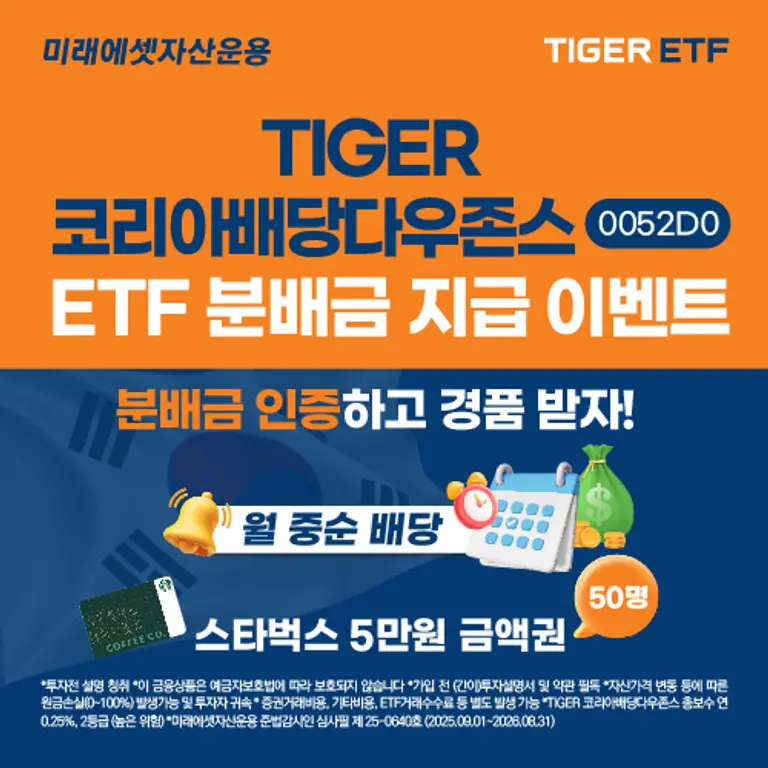 배당 투자에 대한 높은 관심에 미래에셋자산운용은 ‘TIGER 코리아배당다우존스 ETF’ 분배금 인증 이벤트를 진행한다. 10월 3일까지 ‘TIGER 코리아배당다우존스ETF’ 매수 및 분배금 수령 내역을 인증하면 추첨을 통해 경품을 제공한다. 자세한 내용은 TIGER ETF 홈페이지를 통해 확인할 수 있다.