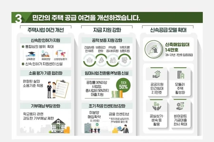 단기간 내 공급 가능한 신축매입임대 14만가구, 공공지원 민간임대주택을 5년간 2만1000가구를 착공한다. 이 중 절반은 2026~2027년에 집중 공급할 예정이며, 공적 보증 확대를 통해 주택 건설사업자에 대한 자금 지원도 강화한다.