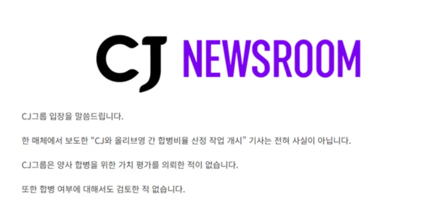 CJ그룹은 "CJ그룹 입장을 말씀드린다"며 "한 매체에서 보도한 “CJ와 올리브영 간 합병비율 산정 작업 개시” 기사는 전혀 사실이 아니다"고 부인했다.
