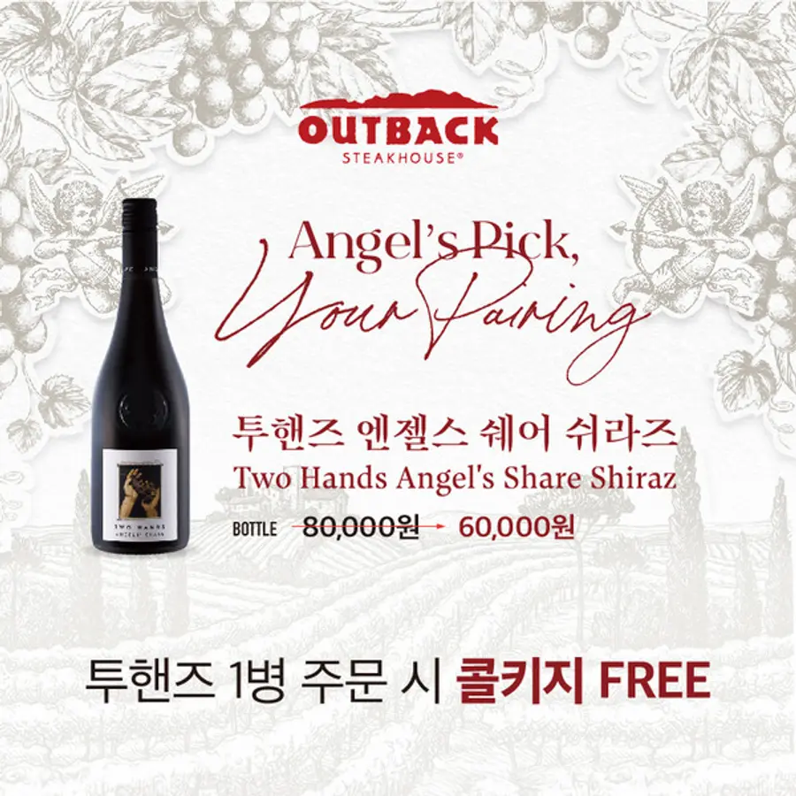 투핸즈 엔젤스 쉐어 쉬라즈는 글로벌 시장에서 영향력 있는 와인 전문지 ‘와인 스펙테이터(Wine Spectator)’에서 총 13번 세계 100대 와인으로 선정된 바 있는 제품이다. 베리류, 서양자두의 달콤하고 진한 아로마와 은은한 화이트 페퍼 향이 감도는 긴 여운을 느낄 수 있어, 풍미가 진한 아웃백 스테이크와 함께 곁들이기 제격이다.
