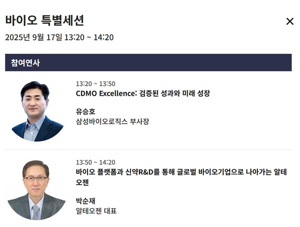 유승호 삼성바이오로직스 부사장의 CDMO 발표에 이어 오후 1시50분부터 2시20분까지 30분간 '바이오 플랫폼과 신약R&D를 통해 글로벌 바이오기업으로 나아가는 알테오젠'을 주제로 발표에 나선다.