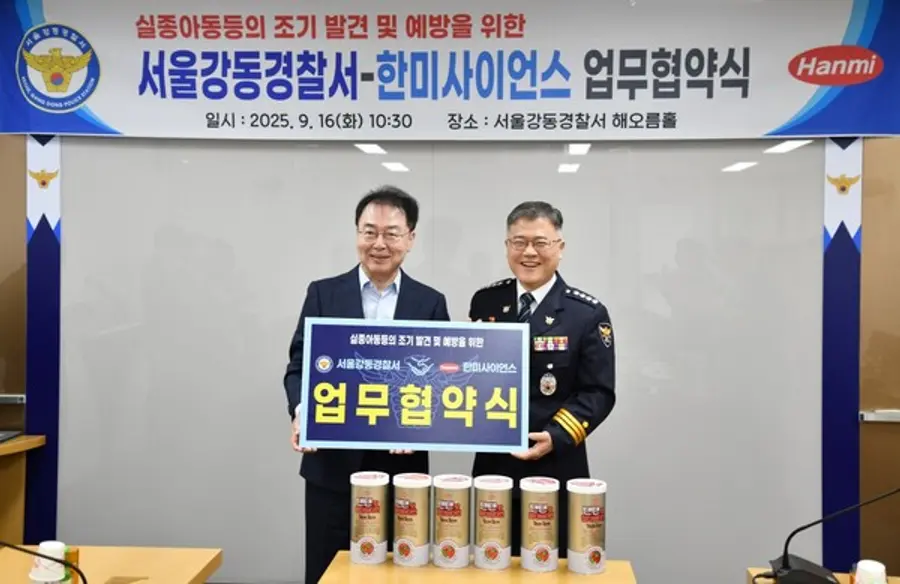 한미사이언스(대표이사 김재교)와 서울강동경찰서(서장 김병주)는 지난 16일 서울강동경찰서에서 양측 관계자들이 모인 가운데 ‘실종아동등의 조기 발견 및 예방을 위한 업무협약식’을 체결했다고 17일 밝혔다.
