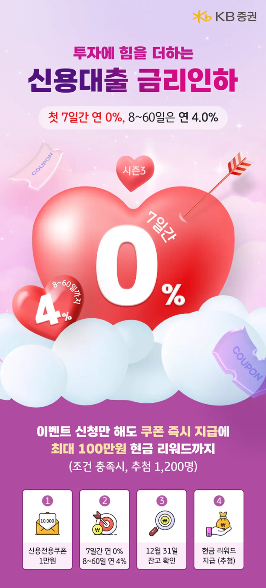 |스마트투데이=김세형 기자| KB증권(대표이사 이홍구, 김성현)은 오는 12월 12일까지 신용대출 신규 및 휴면 고객을 대상으로 ‘투자에 힘을 더하는 신용대출 금리인하 시즌3’ 이벤트를 실시한다고 17일 밝혔다.