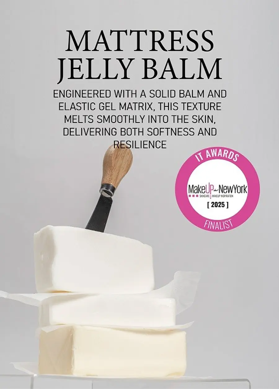 파이널리스트로 선정된 제품은 ‘매트리스 젤리 밤(Mattress Jelly Balm)’으로, 외관은 버터처럼 단단하지만 피부에 바르는 순간 젤리처럼 탄력 있게 풀리는 독창적인 밤(balm) 제형이 특징이다. 풍부한 영양과 보습을 제공하는 동시에 100% 비건 콜라겐 성분인 HumaColl21과 폴리머·왁스 블렌드를 조합해 피부에 탁월한 밀착감과 탄력을 구현했다.