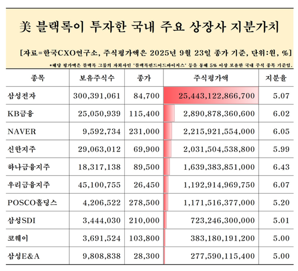 블랙록이 보유한 10개 종목의 이달 23일 종가 기준 합산 주식평가액만 해도 37조 7692억 원이 넘는 것으로 계산됐다. 이는 같은 날 기록한 국내 주식시장 전체 시가총액 3332조 원의 1.1% 수준이다.